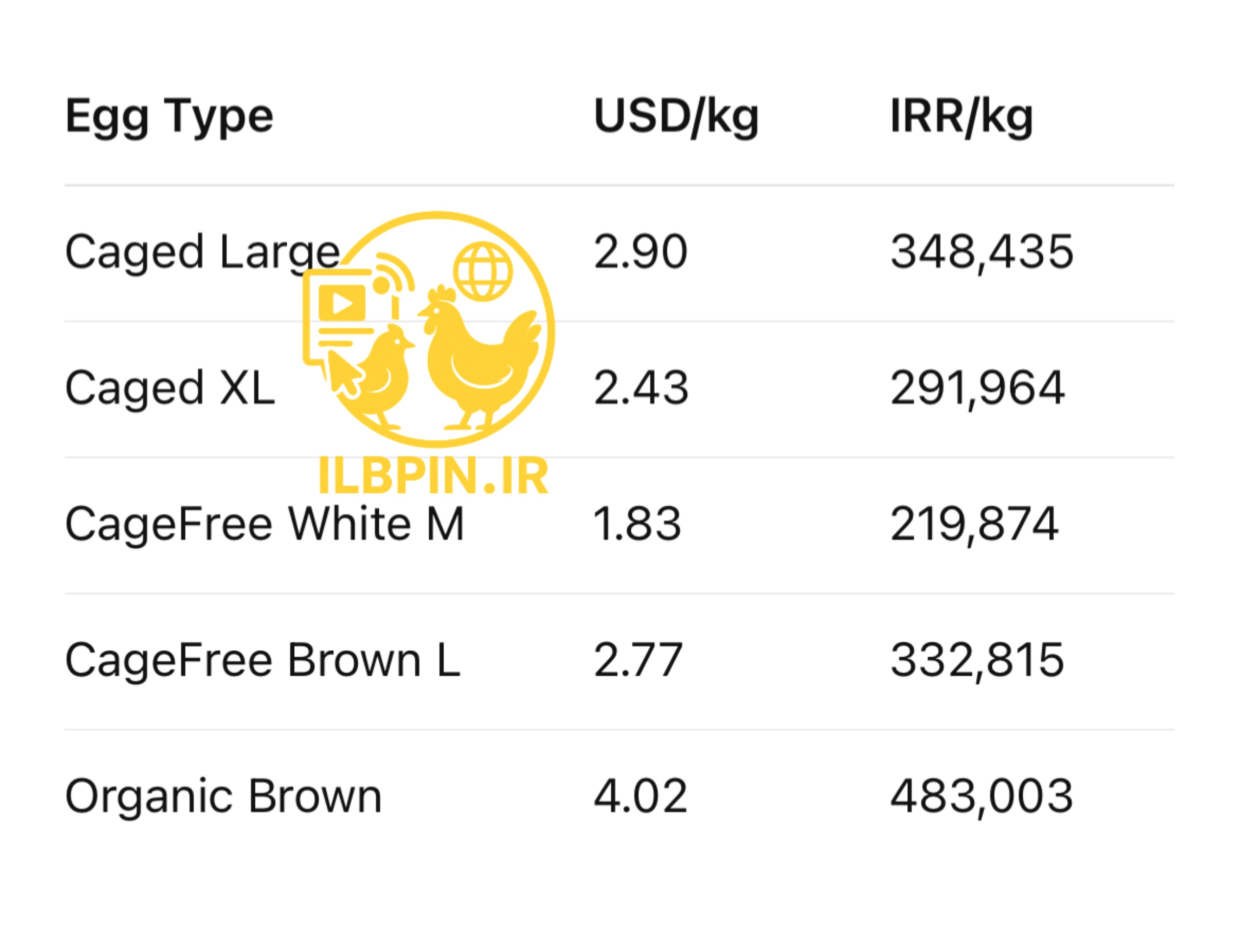 ILBPIN پس از تبدیل قیمتها از «سنت بهازای دوجین» به «دلار بهازای هر کیلو» و سپس تبدیل آن به تومان بر اساس نرخ آزاد ۱۲۰,۱۵۰ تومان، جدول زیر را استخراج کرده است:
