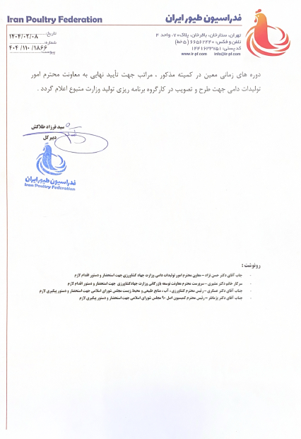 در ادامه، دبیرکل فدراسیون طیور پیشنهاد کرده است که تا زمان تشکیل تشکل صنفی تخصصی، روال موجود مبنی بر تهیه و تصویب برنامه تولید و سیاستگذاری تولید و توزیع جوجه مادر و تخمگذار در کارگروه برنامهریزی تولید دفتر طیور وزارت جهاد کشاورزی حفظ شود.